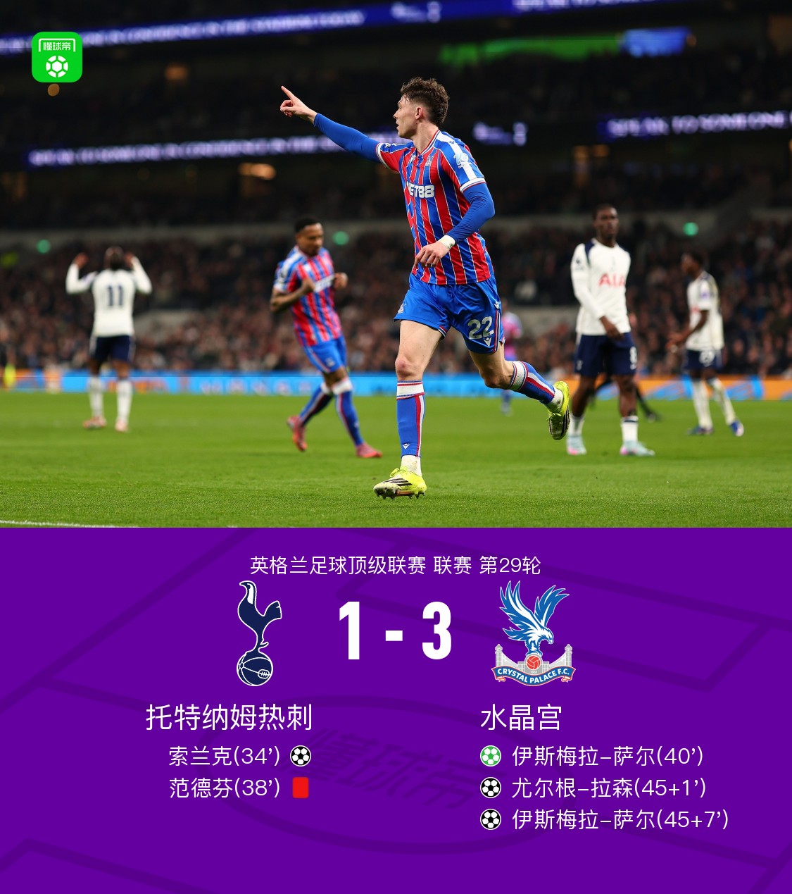 北京时间3月6日英格兰足球顶级联赛联赛第29轮,托特纳姆热刺主场对阵水晶宫。上半场,阿奇-格雷助攻索兰克破门。范德芬拉倒萨尔送点并且被直红罚下,萨尔罚入点球扳平比分。沃顿送出两次助攻,拉森和萨尔相继建功。下半场,两队均无建树。全场比赛结束,热刺1-3不敌水晶宫,遭遇各项赛事的5连败和英超连续11轮不胜。点击查看本场比赛详细数据>>点击查看英超完整积分榜>>关键事件第35分钟2026-03-06 06:00:17